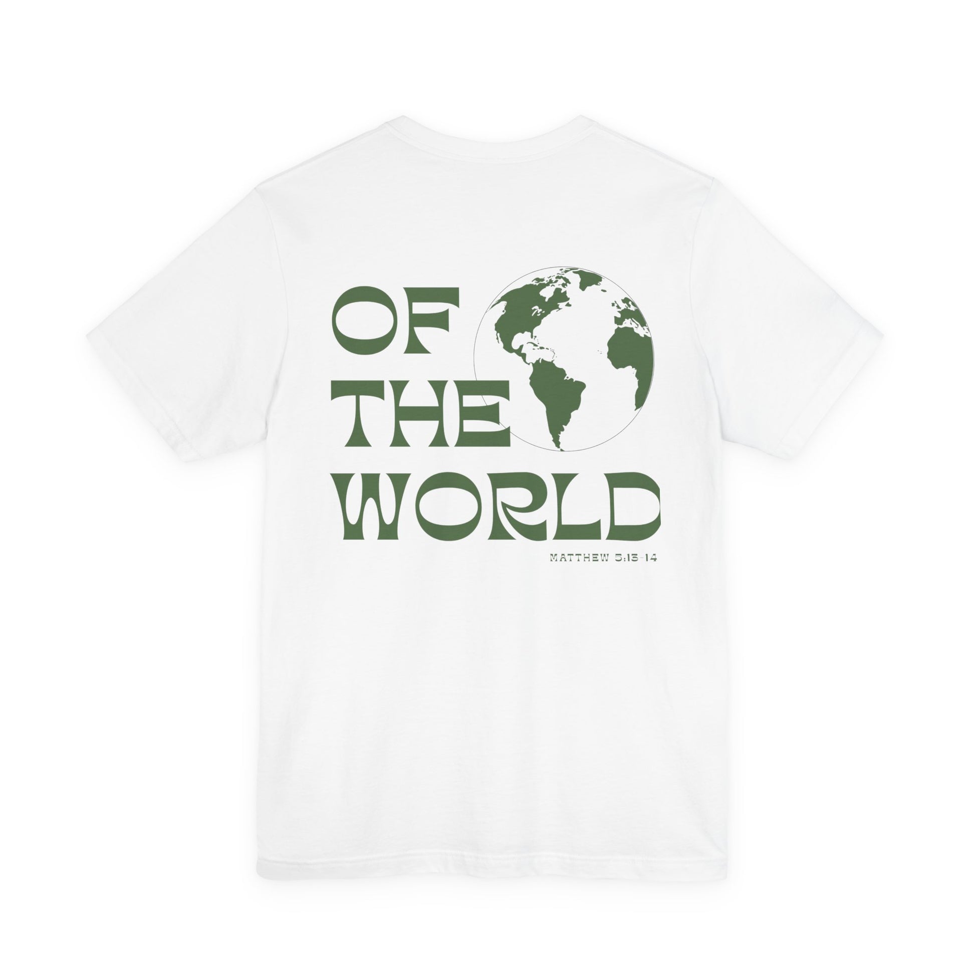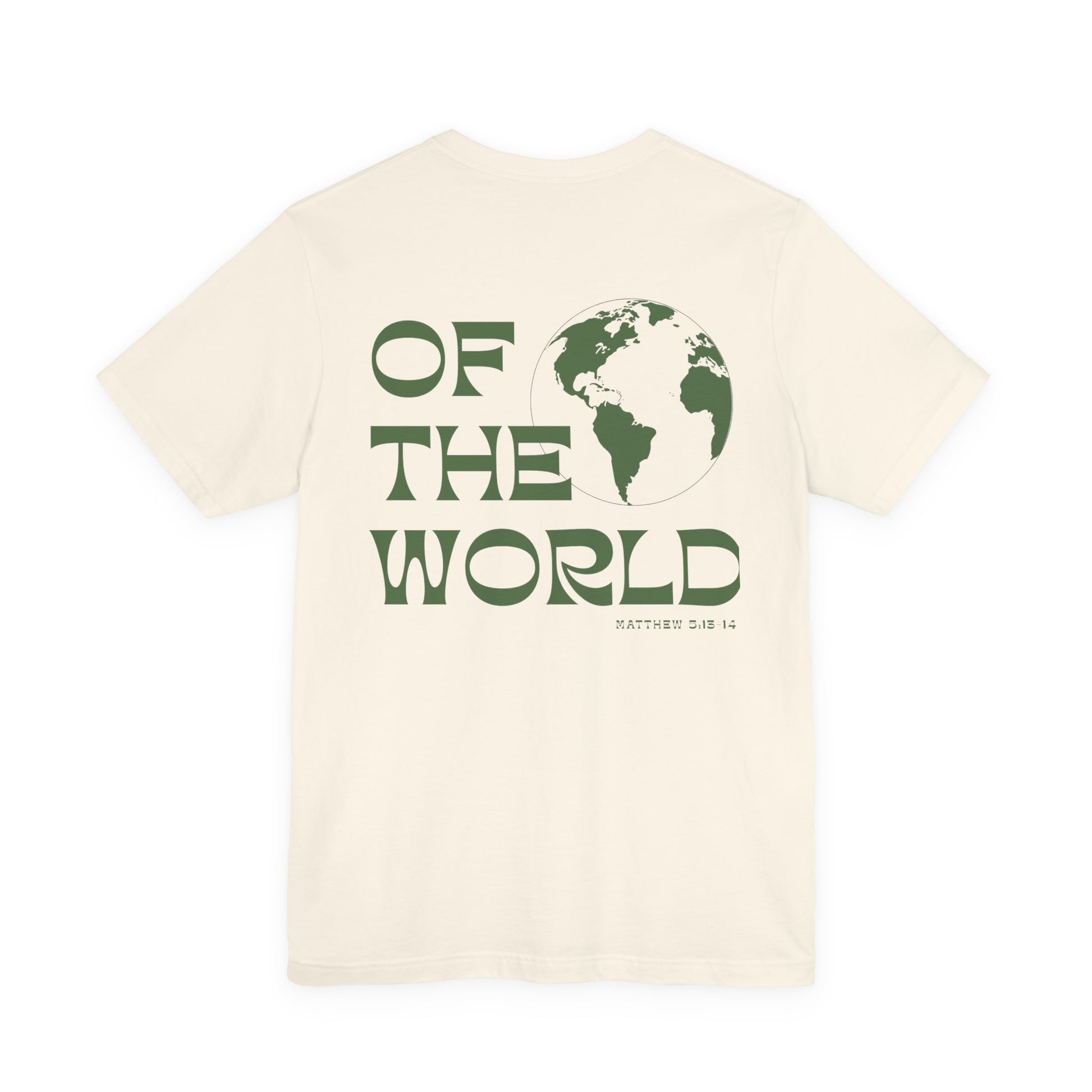 The front keeps it understated, while the back carries a bold visual: a stylized globe paired with sculpted typography reading “OF THE WORLD.”